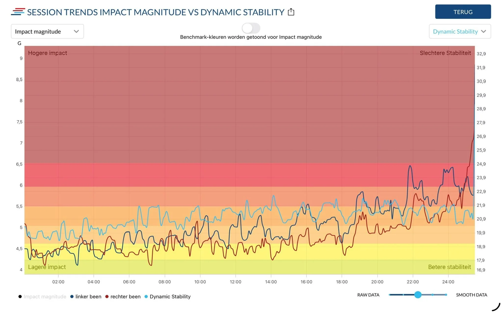 Je begin op je duurlooptempo en eindigt op je wedstrijdtempo, zodat je alle relevante tempo’s hebt gehad. Zo zien we de verschillende parameters (impact, dynamische stabiliteit en symmetrie) bij de verschillende snelheden.